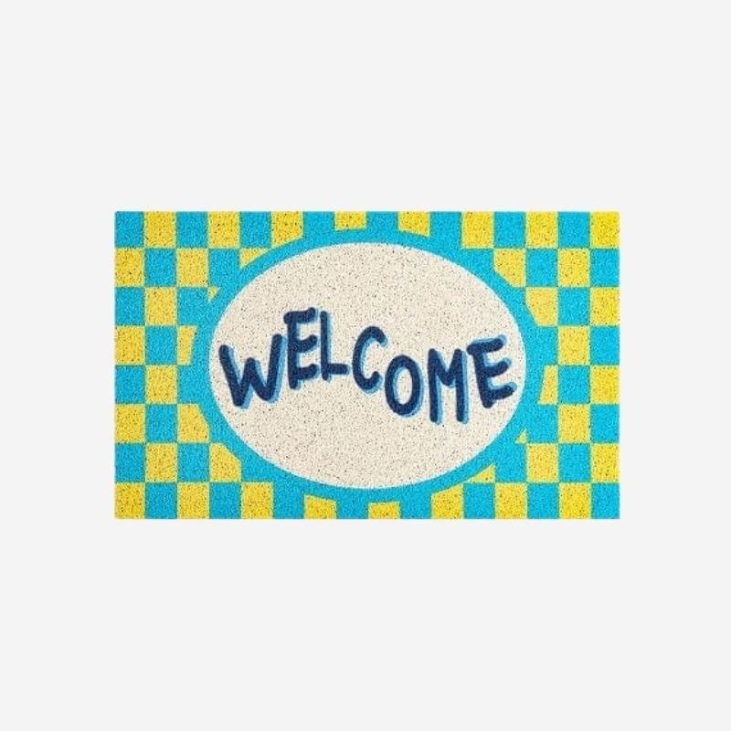 - Unik och iögonfallande design: Med ett lekfullt rutmönster i blått och gult samt ett tydligt "WELCOME"-budskap.